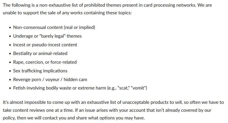 Obviously, this initial action came in response to abrupt pressure from the payment processors that the platform depends on, and would’ve fixed itself with time as its administrators combed through the catalogue and individually restored those unfairly removed. However, a more permanent shift soon appeared in the form of a new list of regulations added to the site’s content policy.