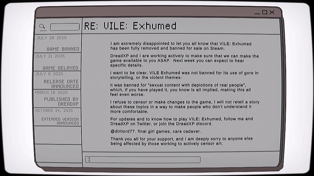 A week later, solo game developer Cara Cadaver spoke out against Steam’s ruling on her upcoming game, VILE: Exhumed. VILE was set to be a visual-novel-esque adventure diving into “themes of sexual content, violence, and abusive and harmful language” - but Steam’s recent debacle led to a total ban on the game, citing the specific rule violated: “sexual content with depictions of real people”. This may appear to be a valid reason to withhold the title from sale, but the truth is somewhat unsettling - the ‘real person’ involved was Cadaver herself, opting to use photos of herself in place of the game’s protagonist to inject a more personal connection into the narrative.